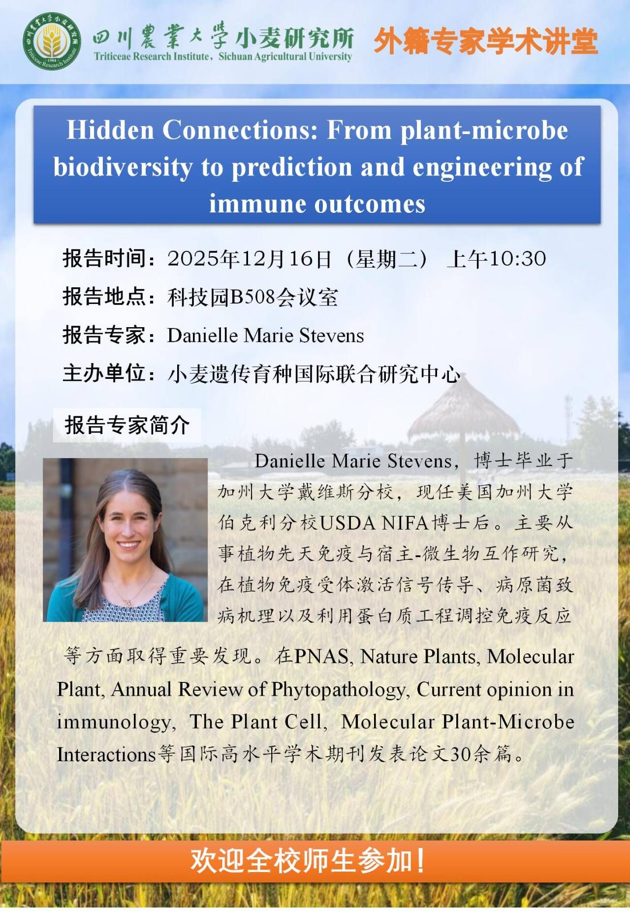 各位搏(硕)士研究生,小麦研究所邀请了加州大学伯克利分校Danielle M Stevens博士于12月16日(周二)上午10点30在科技园B508会议室做学术报告,欢迎大家积极参加!